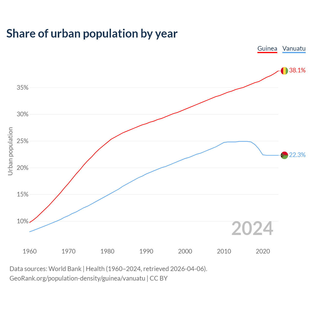 From 2004 to 2024, the share of urban population changed from 32.1% to 38.1% in Guinea and from 22.7% to 22.3% in Vanuatu.
