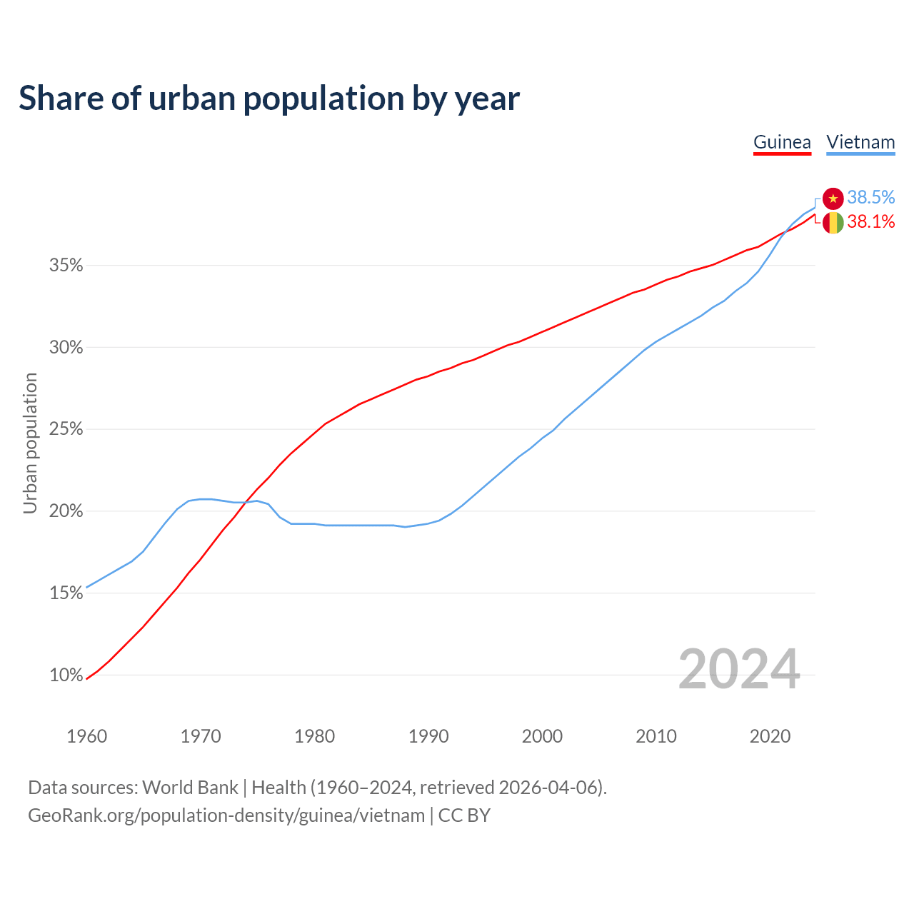 From 2004 to 2024, the share of urban population changed from 32.1% to 38.1% in Guinea and from 26.8% to 38.5% in Vietnam.