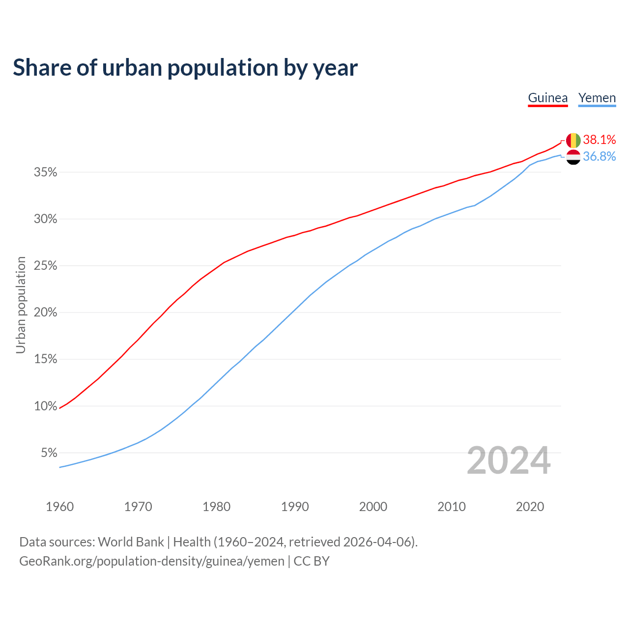 From 2004 to 2024, the share of urban population changed from 32.1% to 38.1% in Guinea and from 28.5% to 36.8% in Yemen.