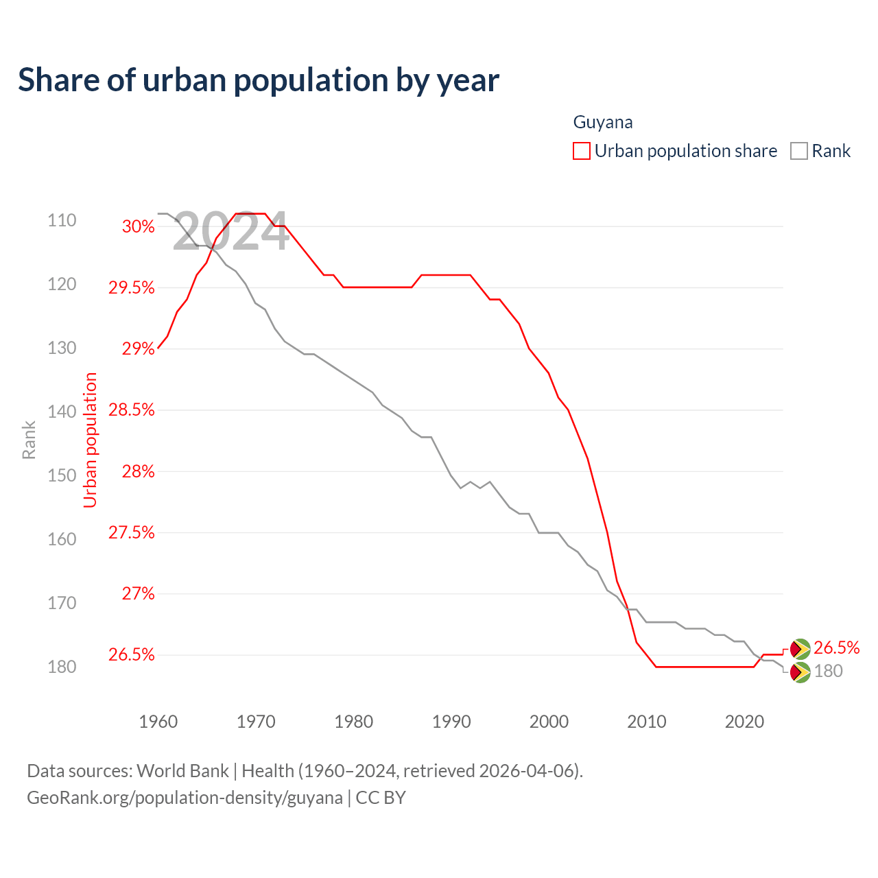 This chart shows the share of urban population in Guyana from 1960 to 2024: 29% lived in urban areas in 1960, 28.8% in 2000, and 26.5% in 2024.