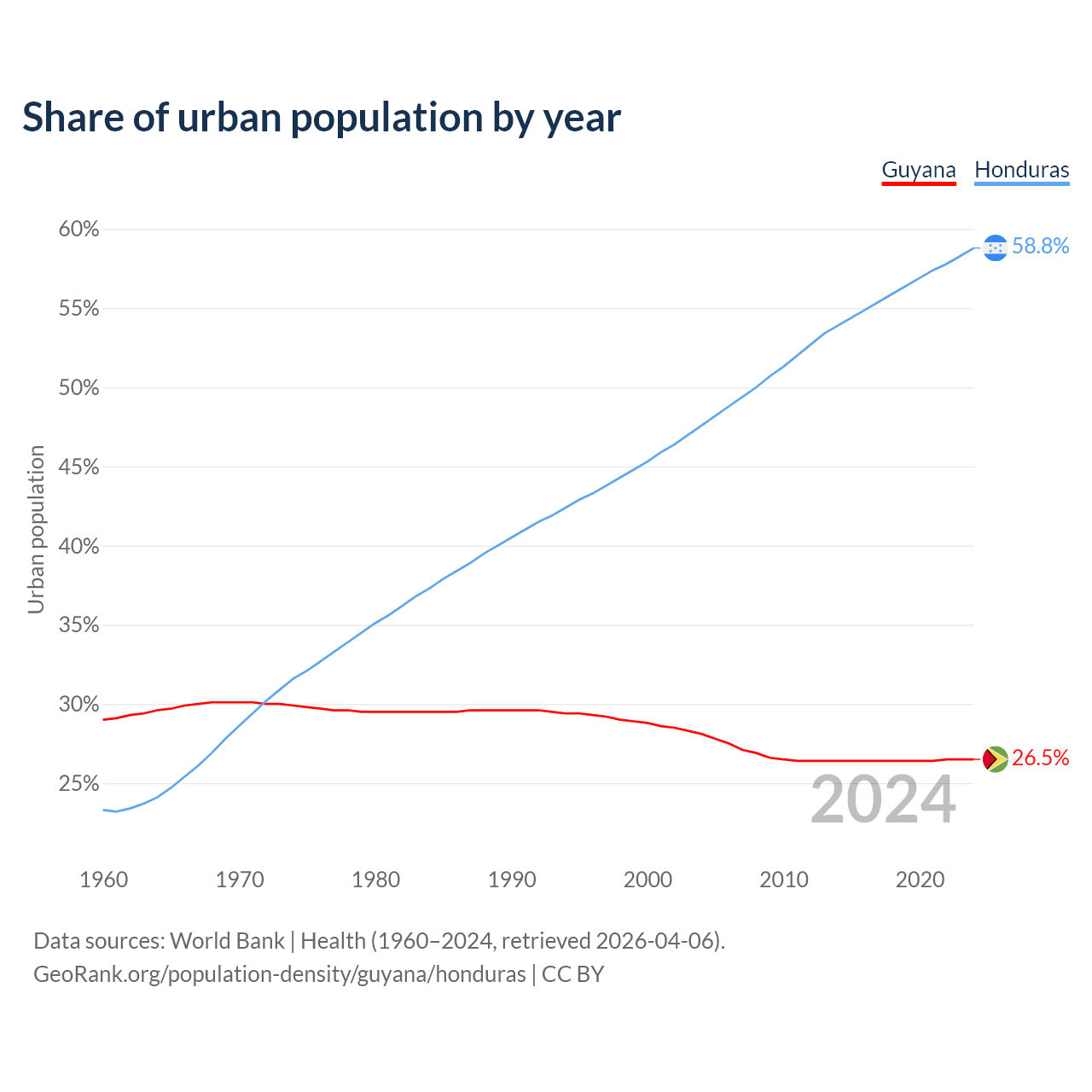 From 2004 to 2024, the share of urban population changed from 28.1% to 26.5% in Guyana and from 47.6% to 58.8% in Honduras.