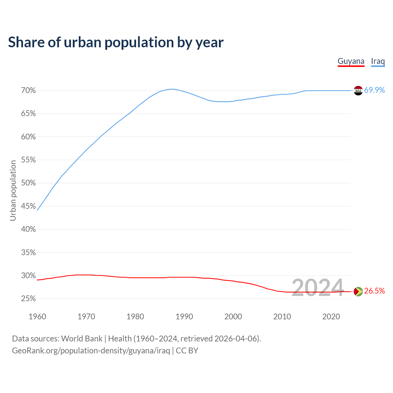 From 2004 to 2024, the share of urban population changed from 28.1% to 26.5% in Guyana and from 68.2% to 69.9% in Iraq.