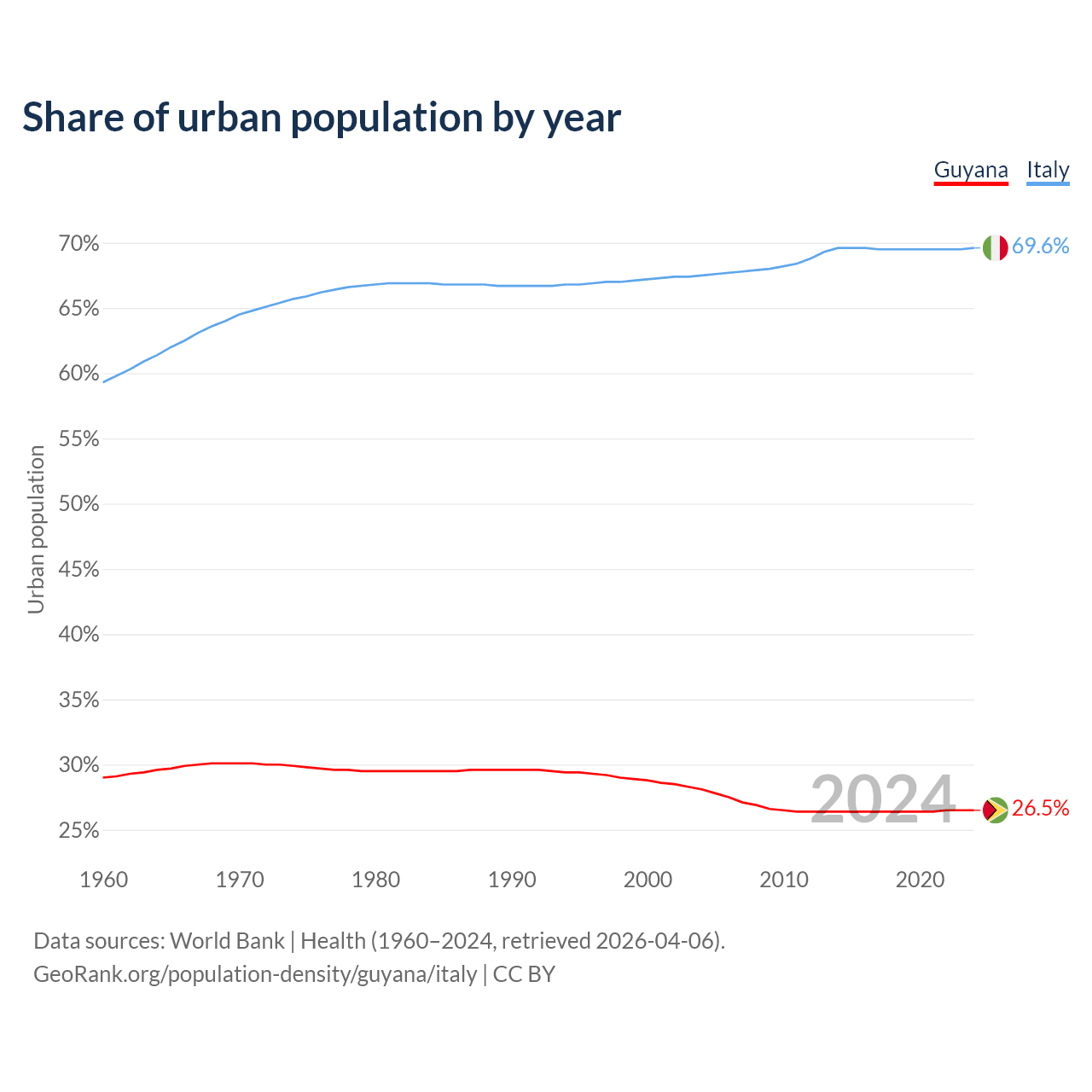 From 2004 to 2024, the share of urban population changed from 28.1% to 26.5% in Guyana and from 67.5% to 69.6% in Italy.