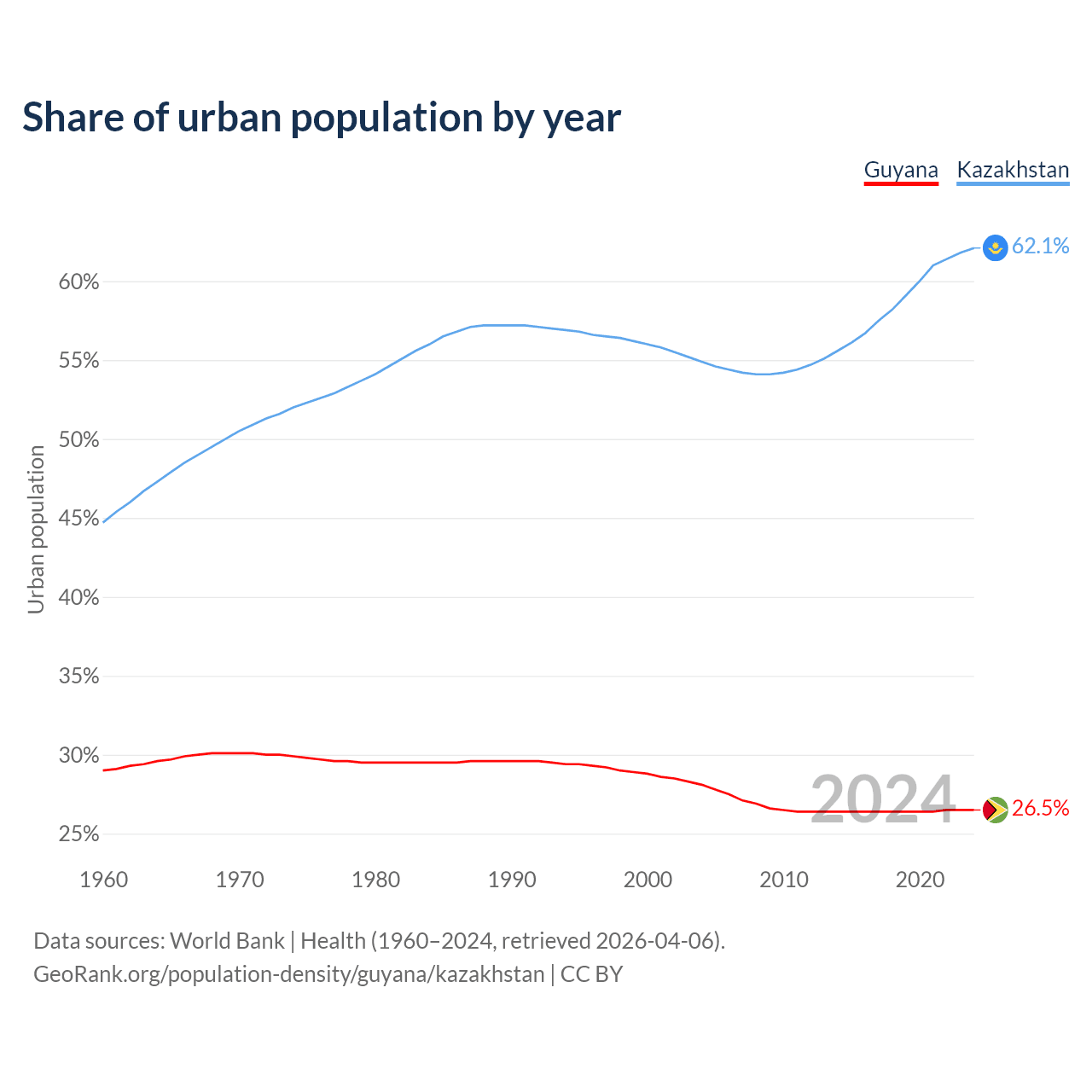 From 2004 to 2024, the share of urban population changed from 28.1% to 26.5% in Guyana and from 54.9% to 62.1% in Kazakhstan.