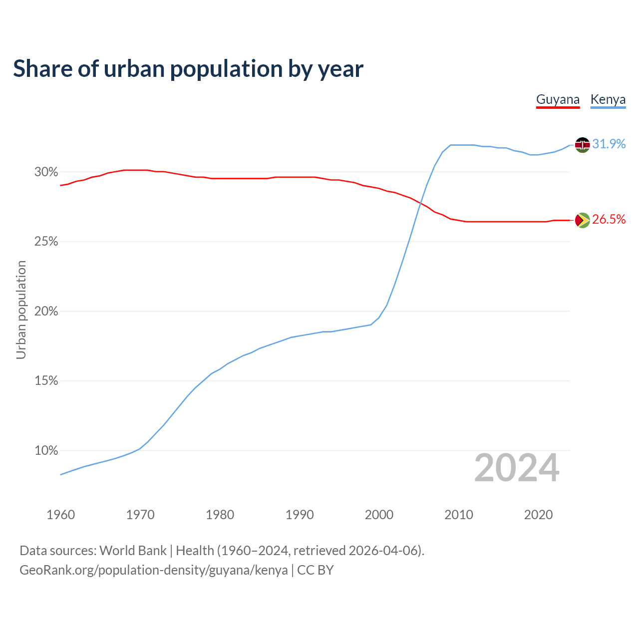 From 2004 to 2024, the share of urban population changed from 28.1% to 26.5% in Guyana and from 25.4% to 31.9% in Kenya.