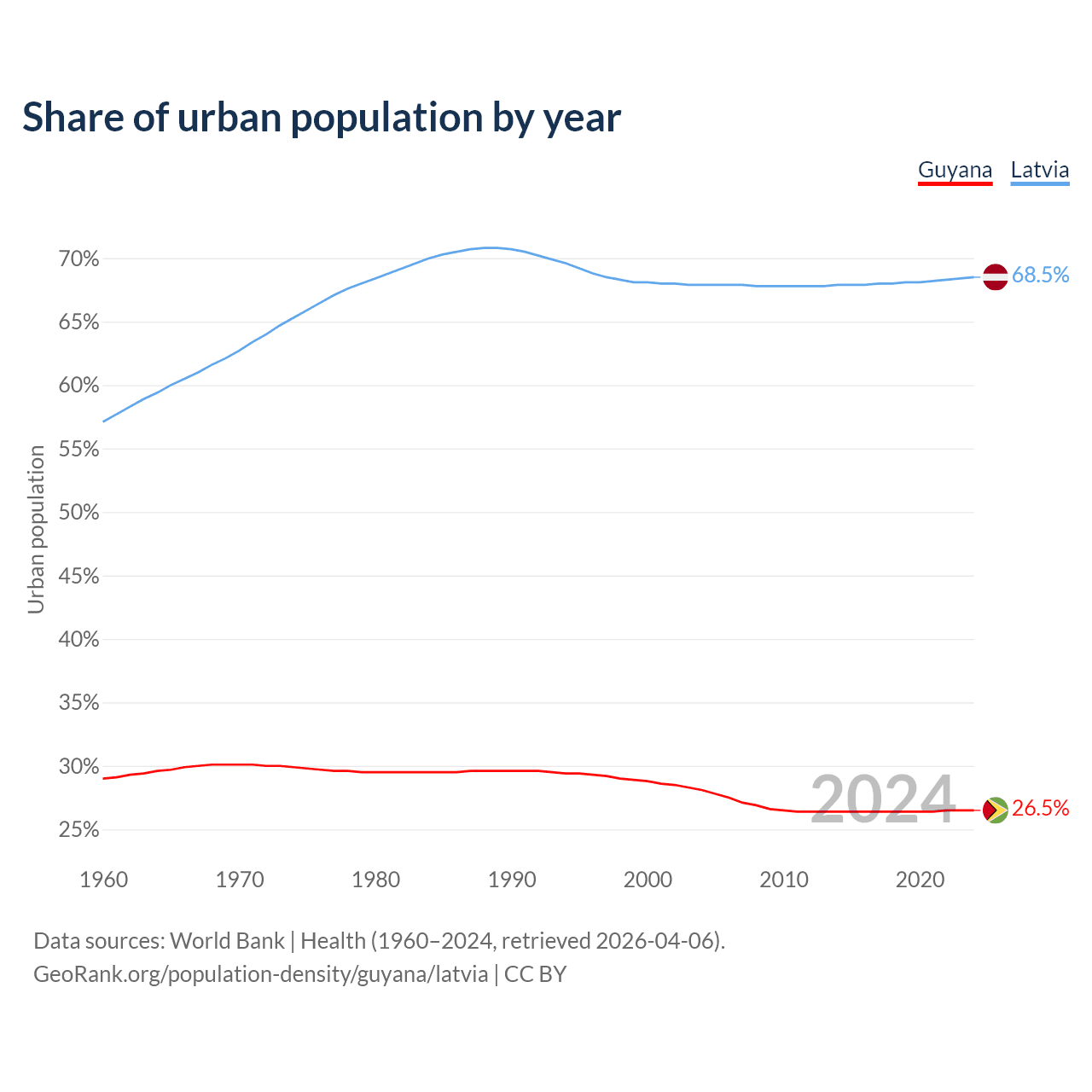 From 2004 to 2024, the share of urban population changed from 28.1% to 26.5% in Guyana and from 67.9% to 68.5% in Latvia.