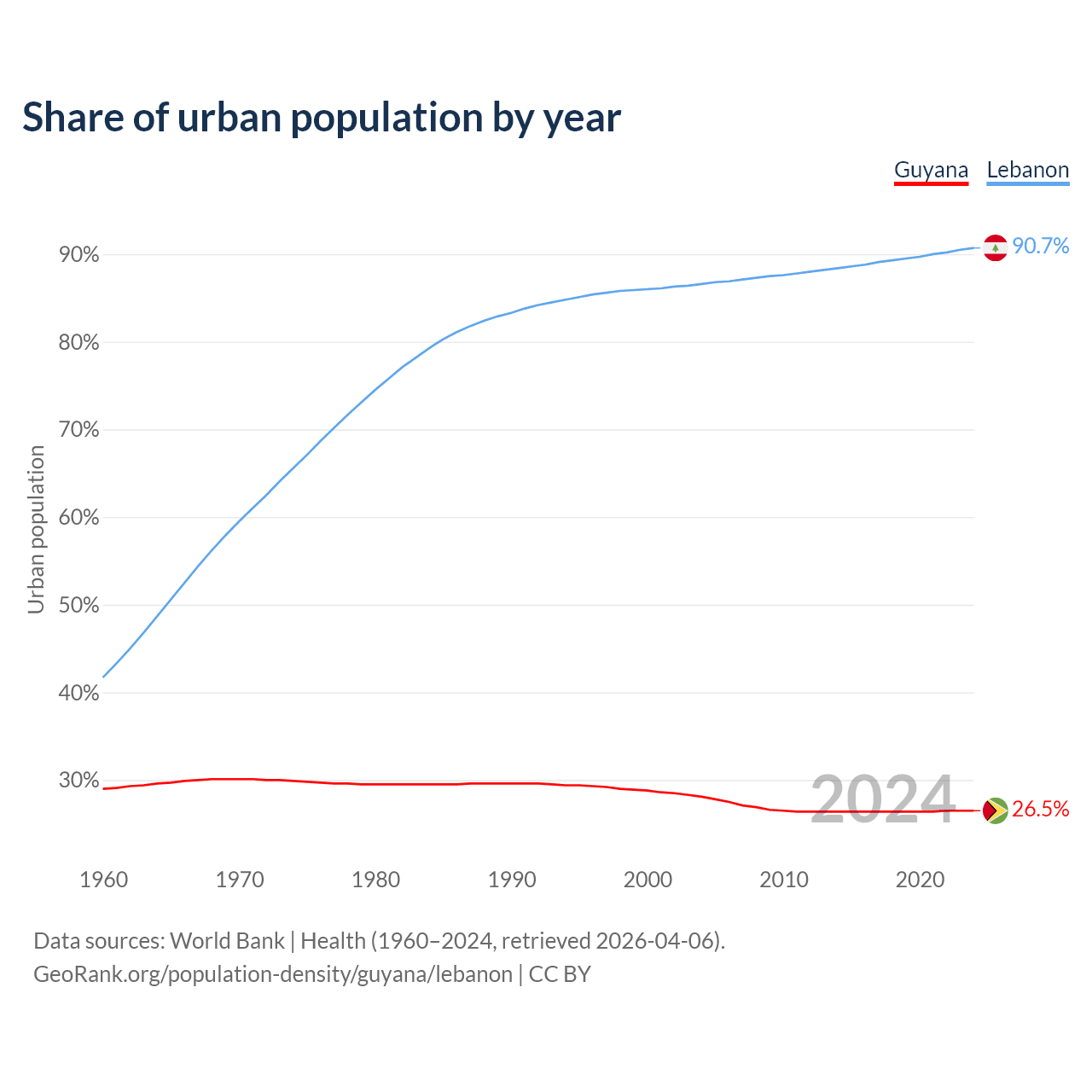 From 2004 to 2024, the share of urban population changed from 28.1% to 26.5% in Guyana and from 86.6% to 90.7% in Lebanon.
