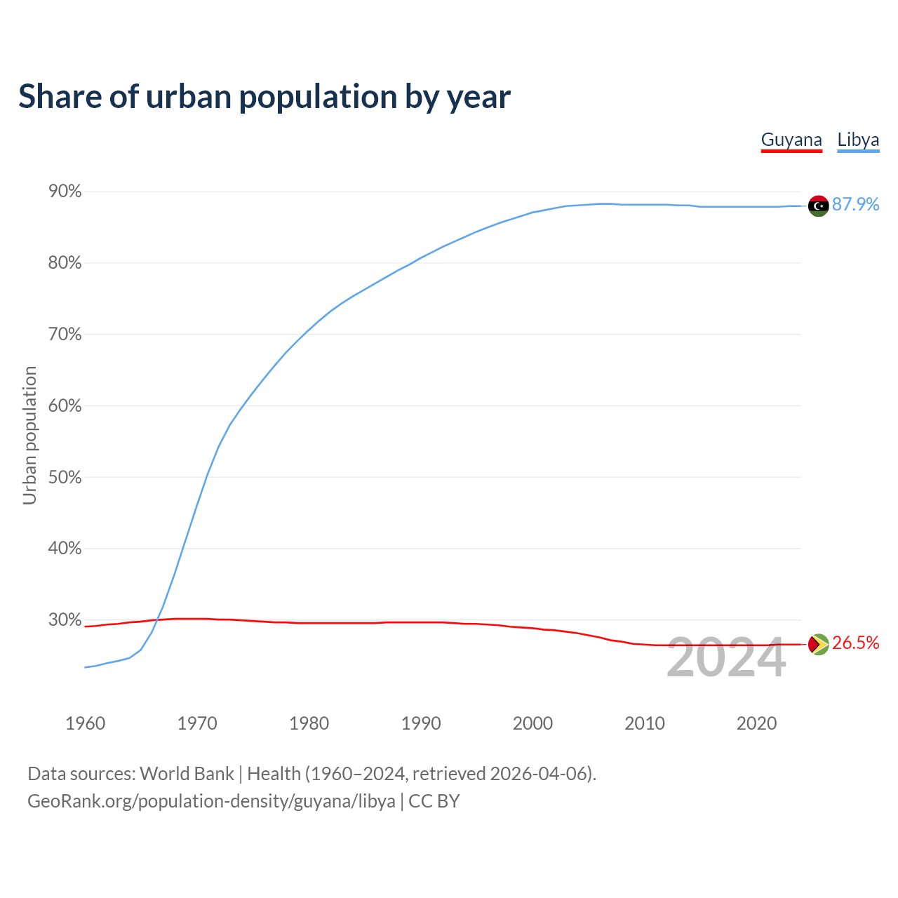 From 2004 to 2024, the share of urban population changed from 28.1% to 26.5% in Guyana and from 88% to 87.9% in Libya.