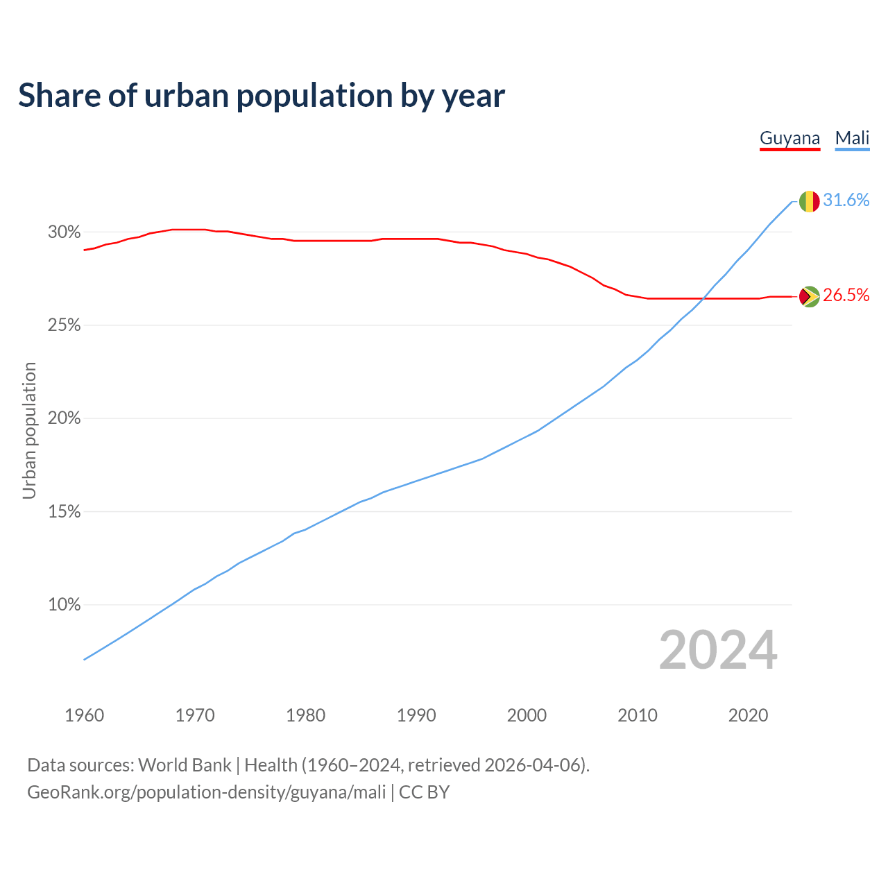 From 2004 to 2024, the share of urban population changed from 28.1% to 26.5% in Guyana and from 20.5% to 31.6% in Mali.
