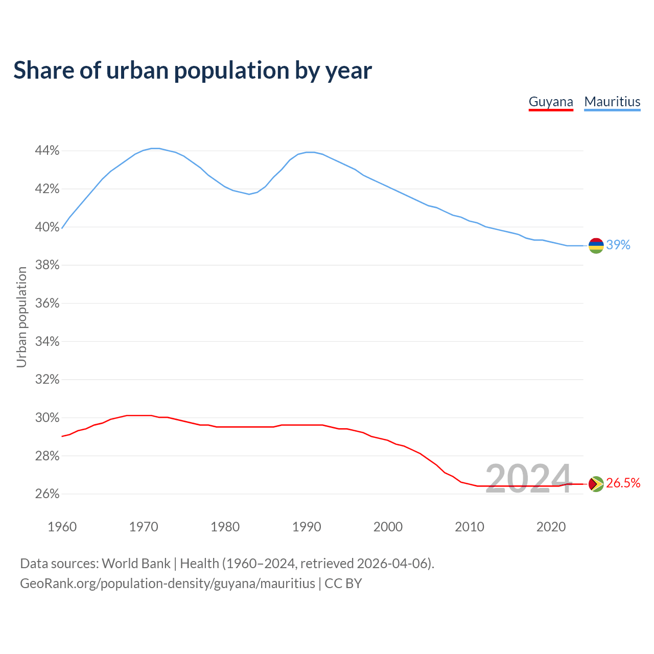 From 2004 to 2024, the share of urban population changed from 28.1% to 26.5% in Guyana and from 41.3% to 39% in Mauritius.