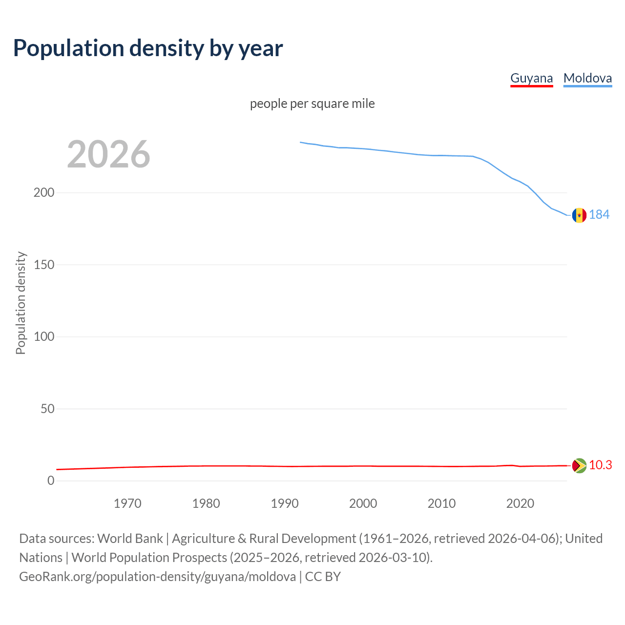 From 2006 to 2026, population density in Guyana increased by 3.3%, compared to a 18.8% decline in Moldova.