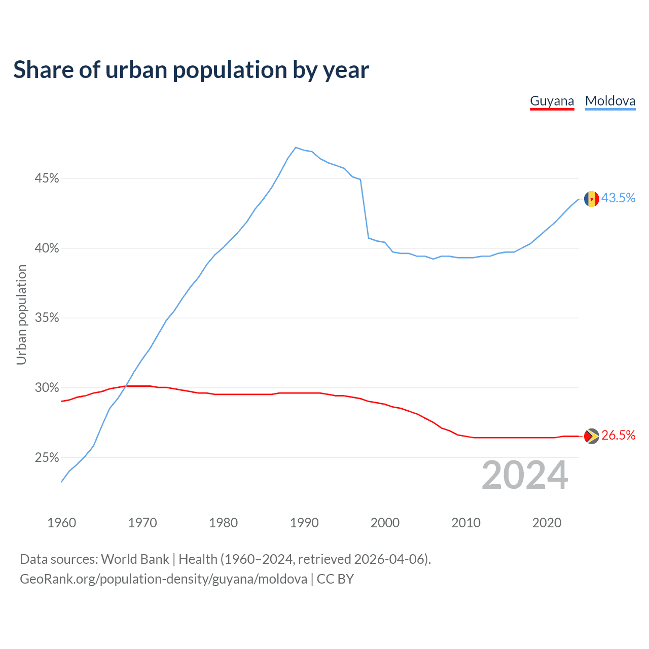 From 2004 to 2024, the share of urban population changed from 28.1% to 26.5% in Guyana and from 39.4% to 43.5% in Moldova.
