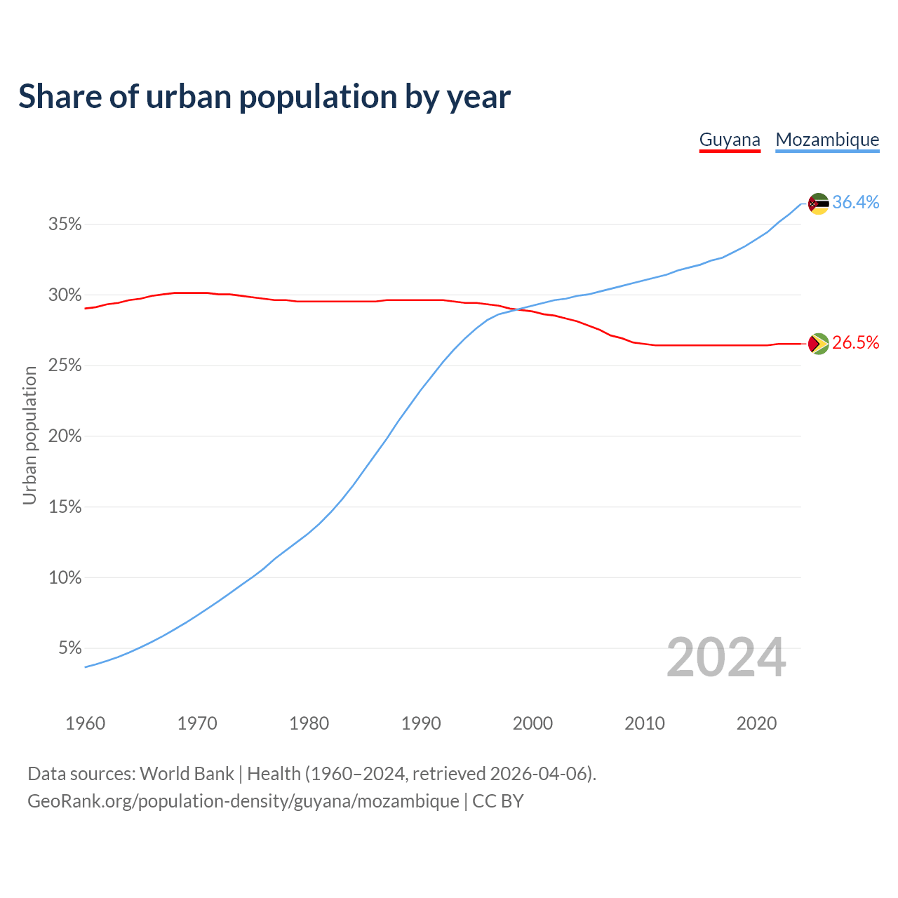 From 2004 to 2024, the share of urban population changed from 28.1% to 26.5% in Guyana and from 29.9% to 36.4% in Mozambique.