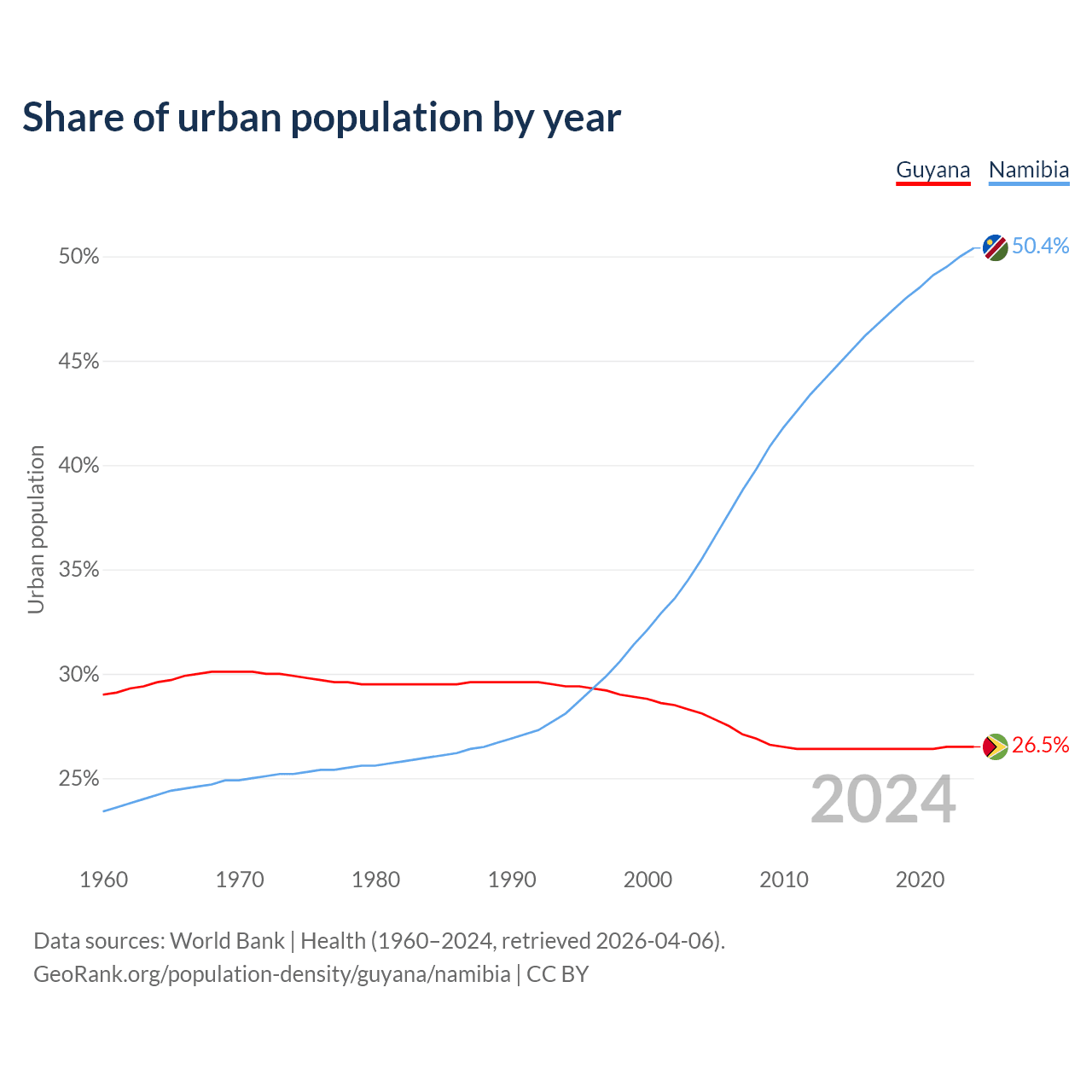 From 2004 to 2024, the share of urban population changed from 28.1% to 26.5% in Guyana and from 35.5% to 50.4% in Namibia.