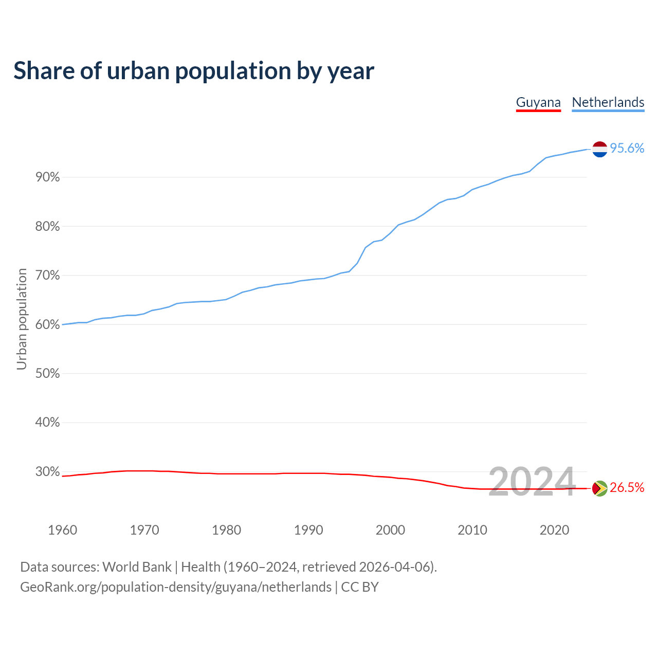 From 2004 to 2024, the share of urban population changed from 28.1% to 26.5% in Guyana and from 82.3% to 95.6% in the Netherlands.