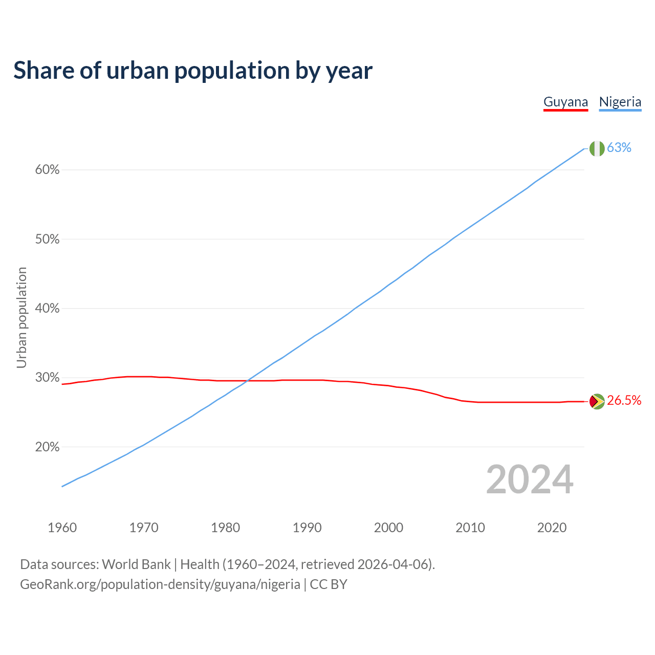 From 2004 to 2024, the share of urban population changed from 28.1% to 26.5% in Guyana and from 46.7% to 63% in Nigeria.