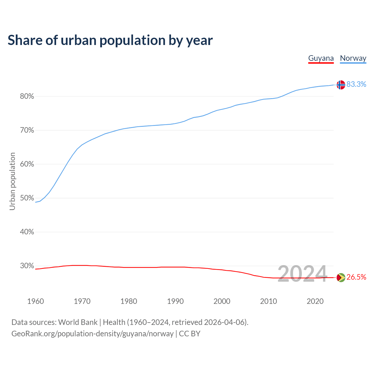 From 2004 to 2024, the share of urban population changed from 28.1% to 26.5% in Guyana and from 77.6% to 83.3% in Norway.