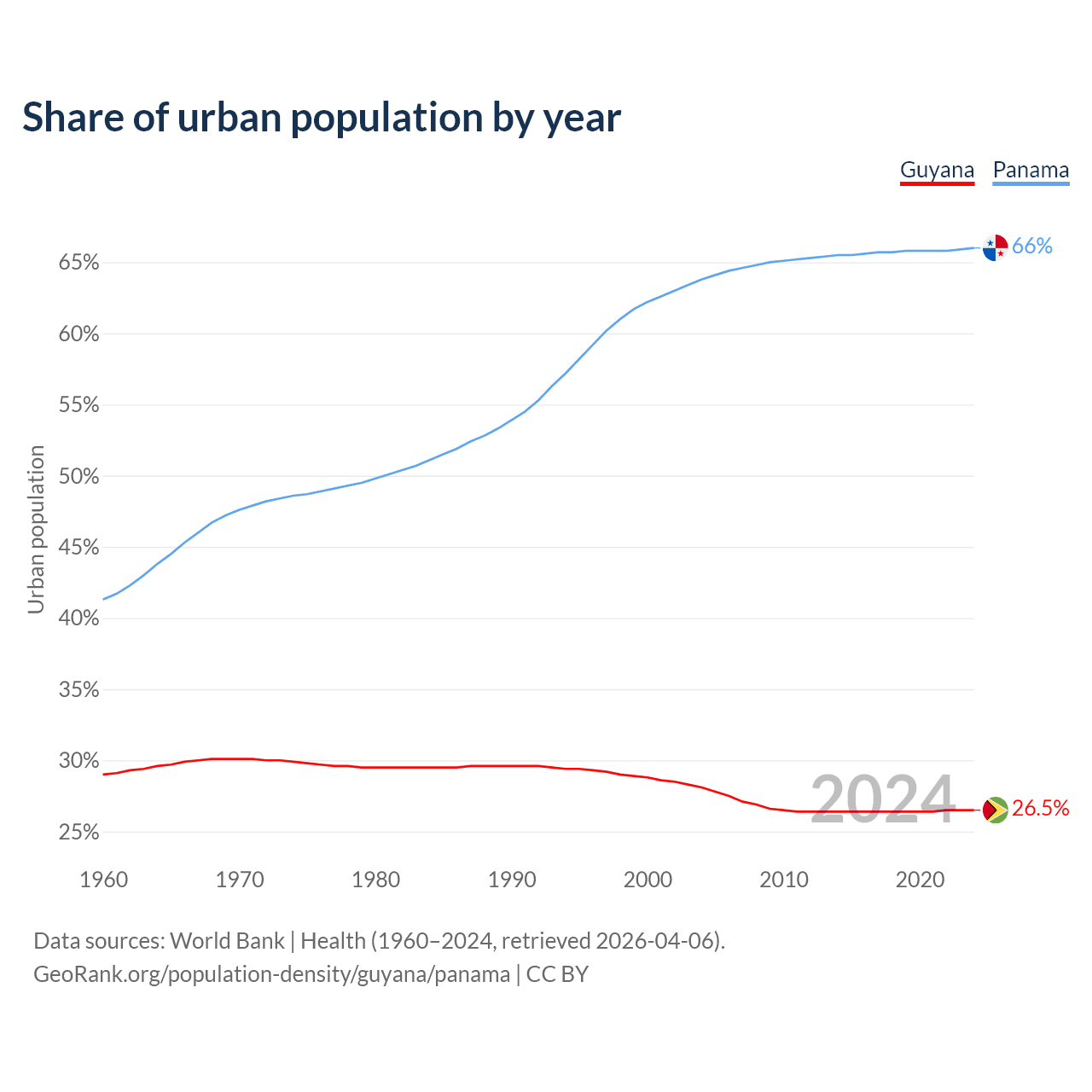 From 2004 to 2024, the share of urban population changed from 28.1% to 26.5% in Guyana and from 63.8% to 66% in Panama.