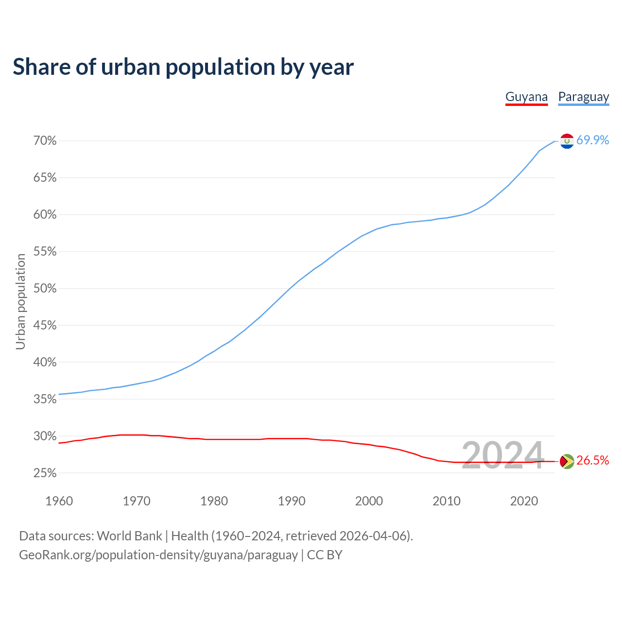 From 2004 to 2024, the share of urban population changed from 28.1% to 26.5% in Guyana and from 58.7% to 69.9% in Paraguay.