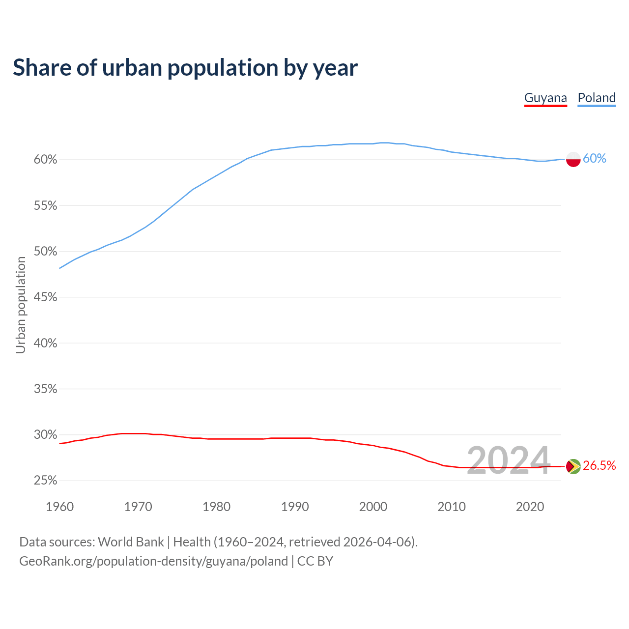 From 2004 to 2024, the share of urban population changed from 28.1% to 26.5% in Guyana and from 61.7% to 60% in Poland.