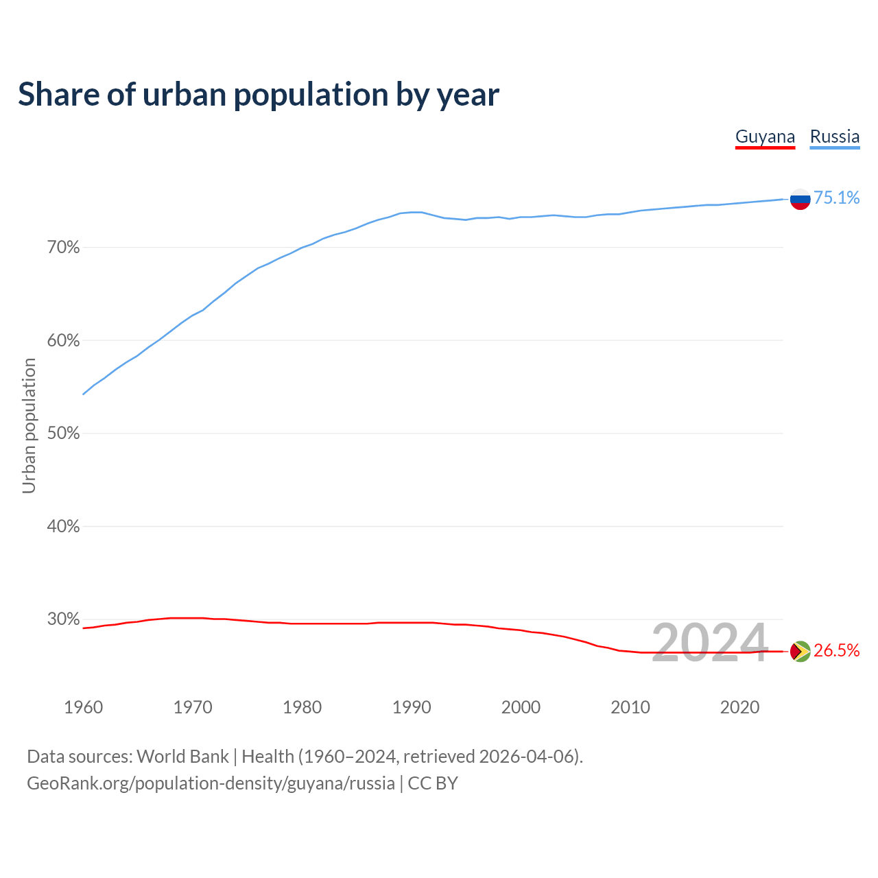 From 2004 to 2024, the share of urban population changed from 28.1% to 26.5% in Guyana and from 73.3% to 75.1% in Russia.