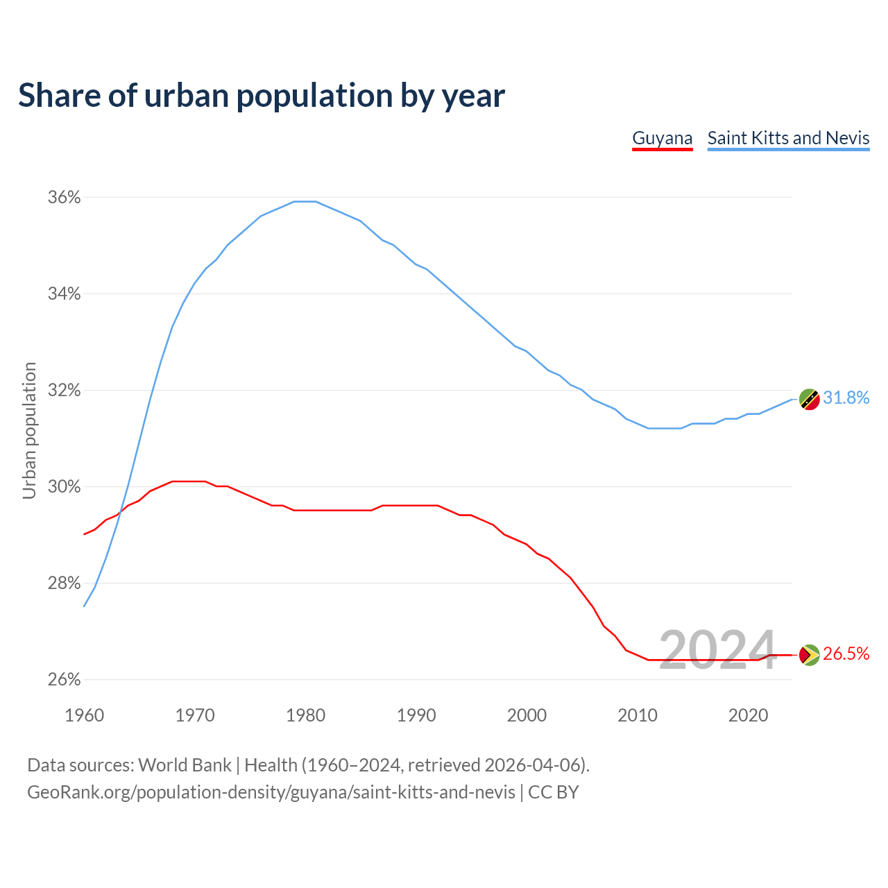 From 2004 to 2024, the share of urban population changed from 28.1% to 26.5% in Guyana and from 32.1% to 31.8% in Saint Kitts and Nevis.