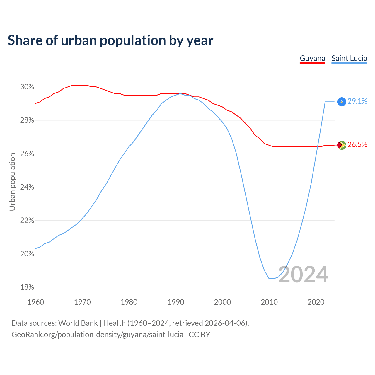 From 2004 to 2024, the share of urban population changed from 28.1% to 26.5% in Guyana and from 24.8% to 29.1% in Saint Lucia.
