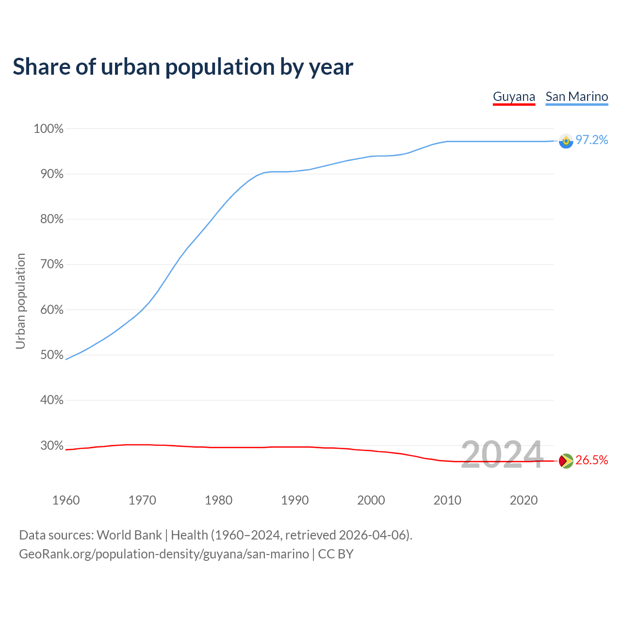 From 2004 to 2024, the share of urban population changed from 28.1% to 26.5% in Guyana and from 94.2% to 97.2% in San Marino.