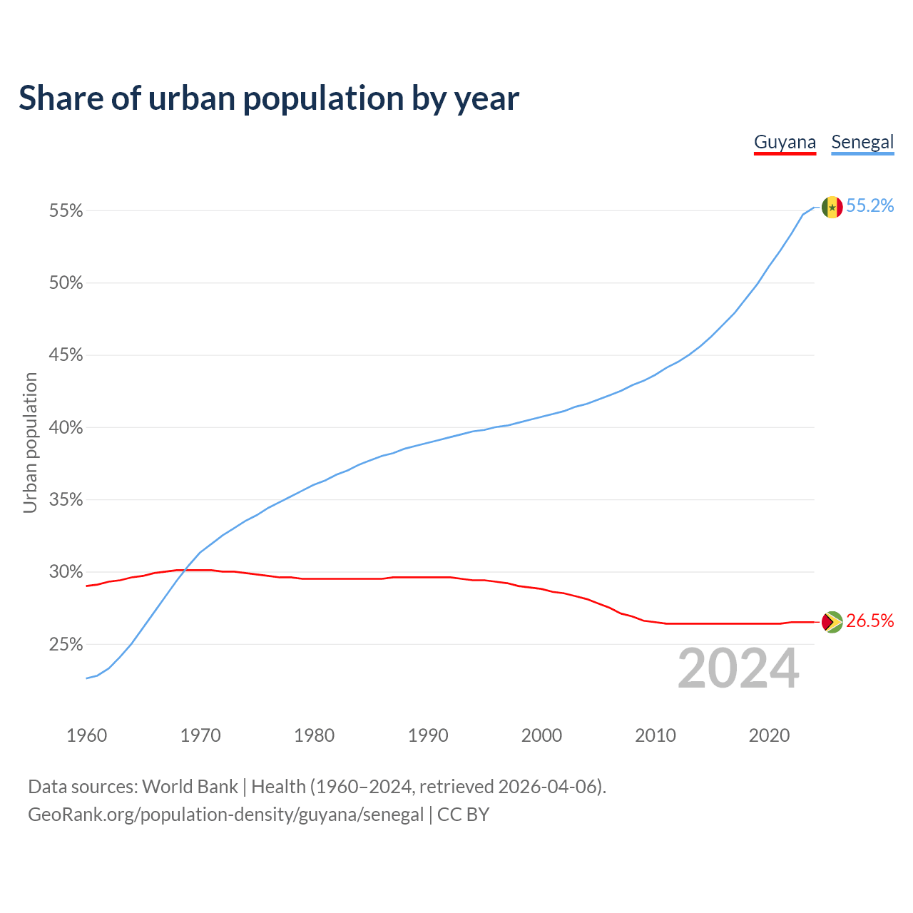 From 2004 to 2024, the share of urban population changed from 28.1% to 26.5% in Guyana and from 41.6% to 55.2% in Senegal.