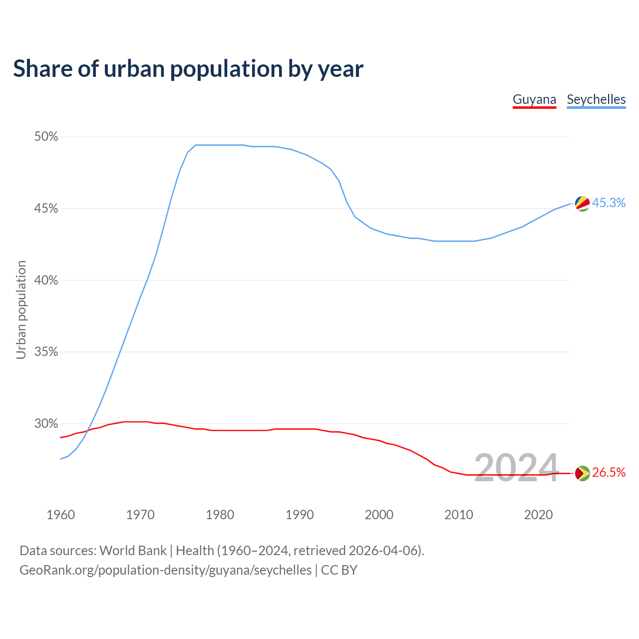 From 2004 to 2024, the share of urban population changed from 28.1% to 26.5% in Guyana and from 42.9% to 45.3% in the Seychelles.