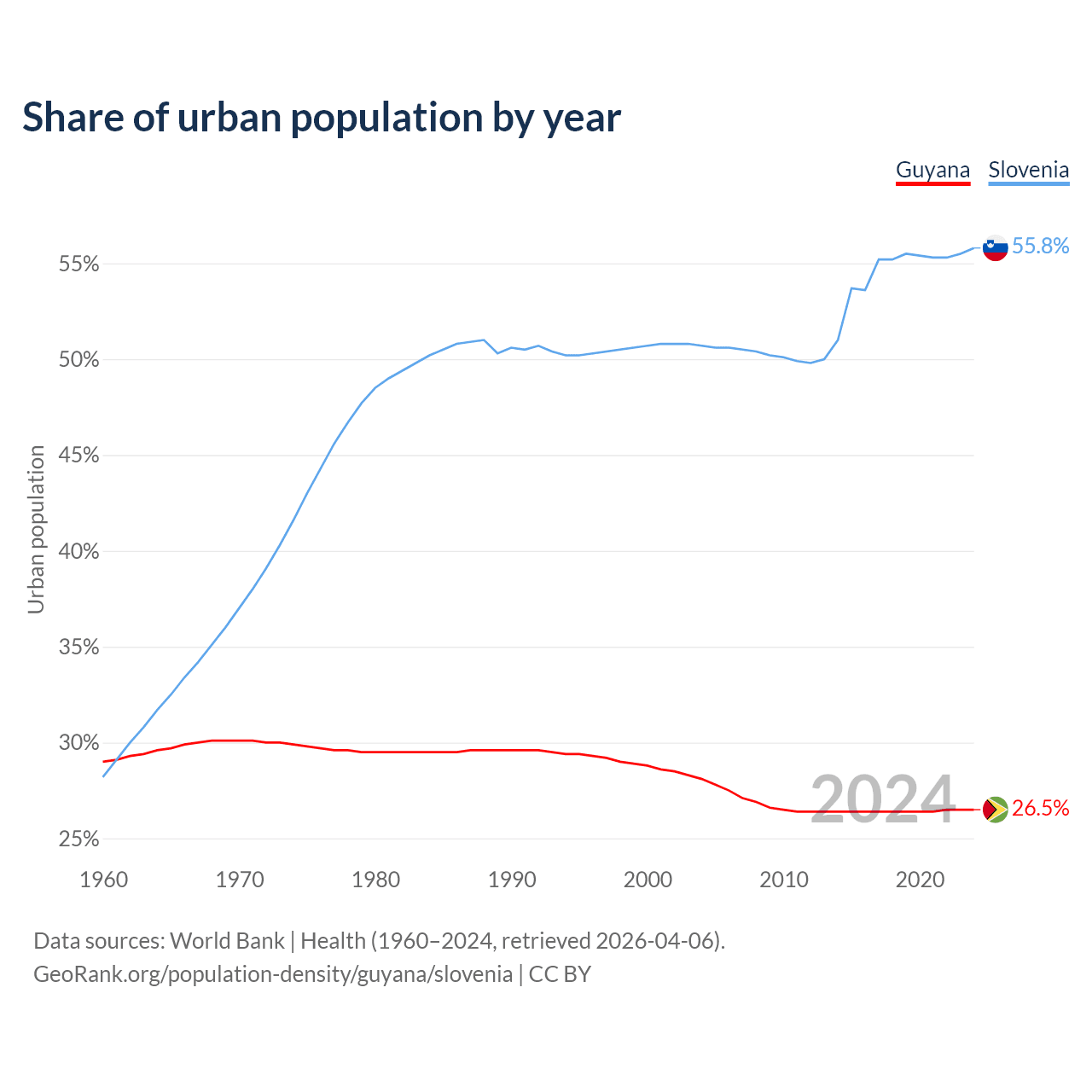 From 2004 to 2024, the share of urban population changed from 28.1% to 26.5% in Guyana and from 50.7% to 55.8% in Slovenia.