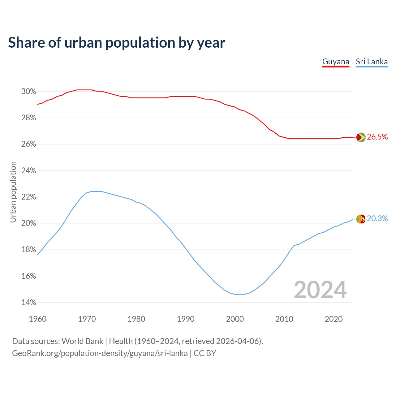 From 2004 to 2024, the share of urban population changed from 28.1% to 26.5% in Guyana and from 14.9% to 20.3% in Sri Lanka.