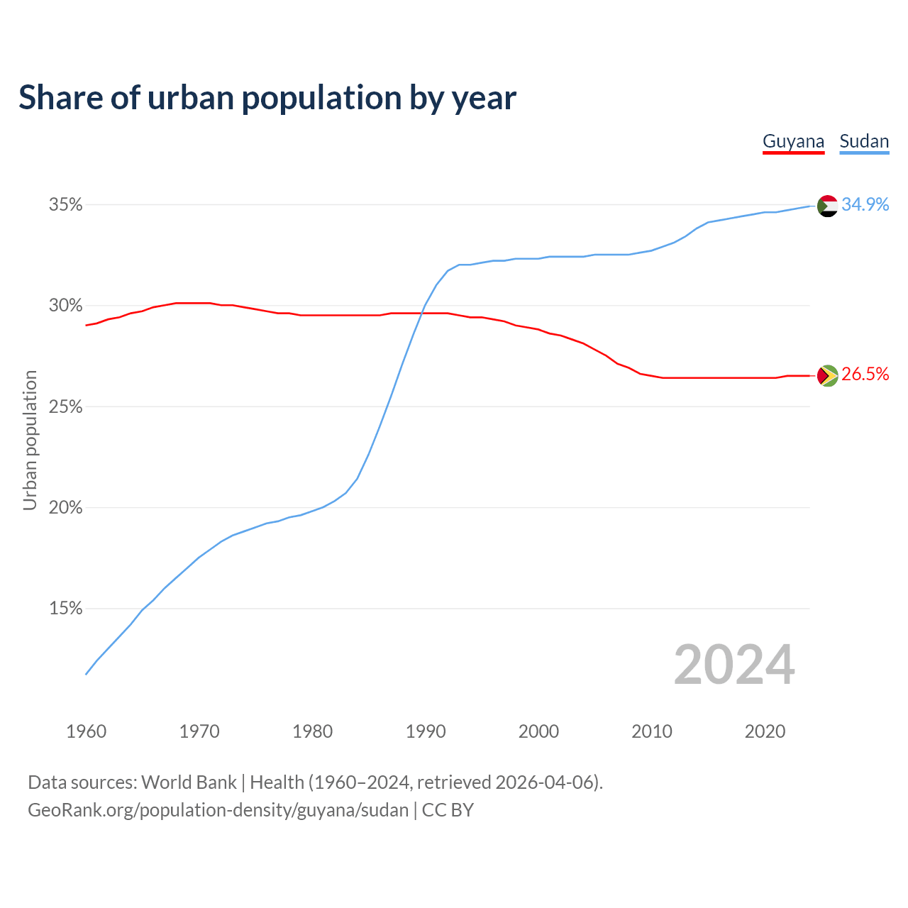 From 2004 to 2024, the share of urban population changed from 28.1% to 26.5% in Guyana and from 32.4% to 34.9% in Sudan.