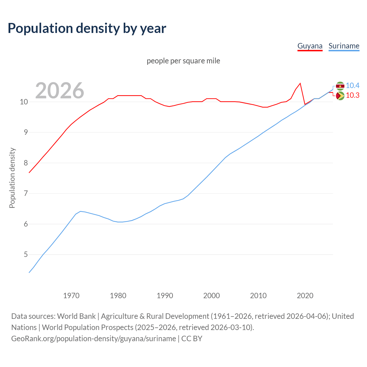 From 2006 to 2026, population density in Guyana increased by 3.3%, compared to a 22.9% growth in Suriname.