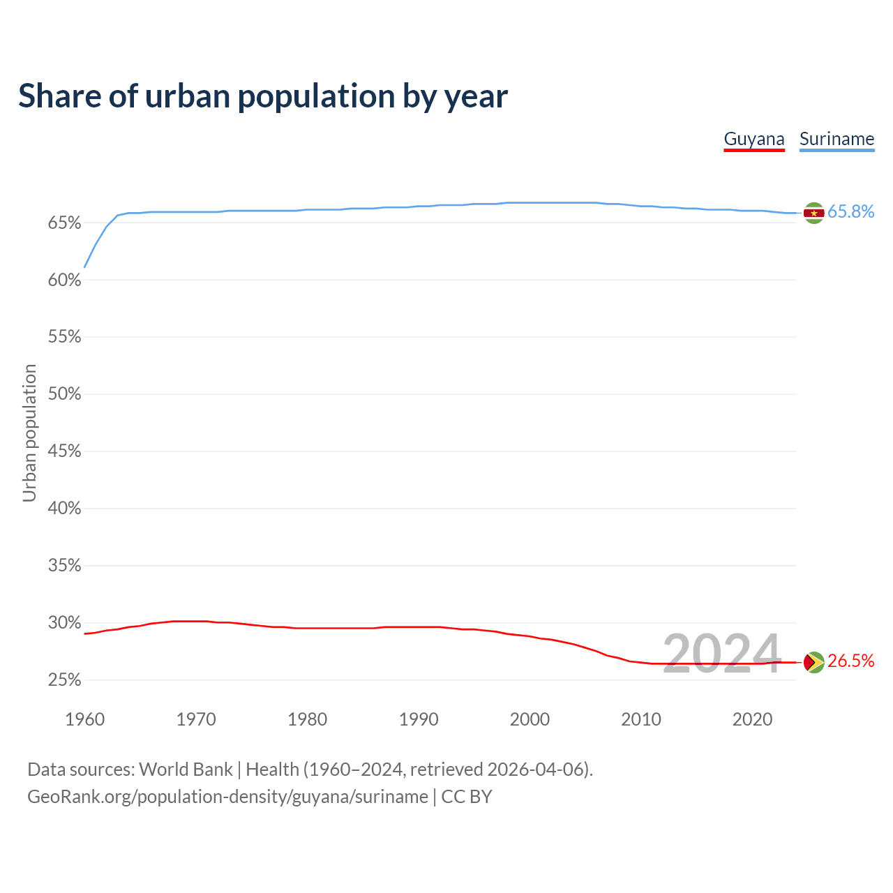 From 2004 to 2024, the share of urban population changed from 28.1% to 26.5% in Guyana and from 66.7% to 65.8% in Suriname.