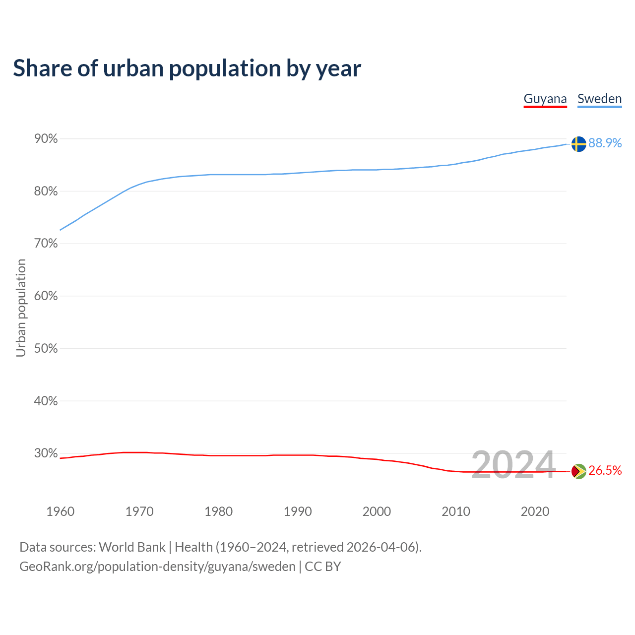 From 2004 to 2024, the share of urban population changed from 28.1% to 26.5% in Guyana and from 84.3% to 88.9% in Sweden.