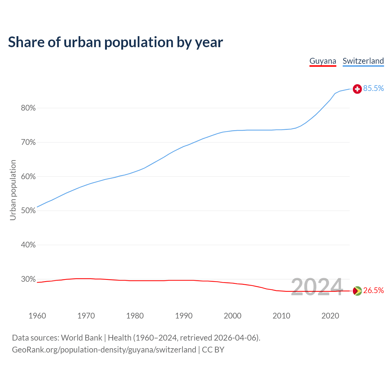 From 2004 to 2024, the share of urban population changed from 28.1% to 26.5% in Guyana and from 73.5% to 85.5% in Switzerland.