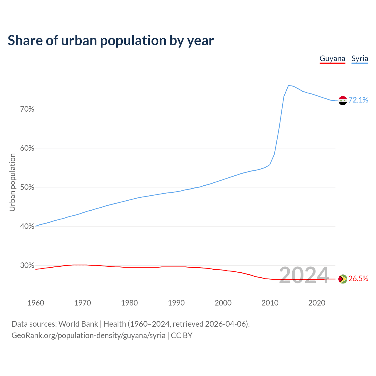 From 2004 to 2024, the share of urban population changed from 28.1% to 26.5% in Guyana and from 53.5% to 72.1% in Syria.