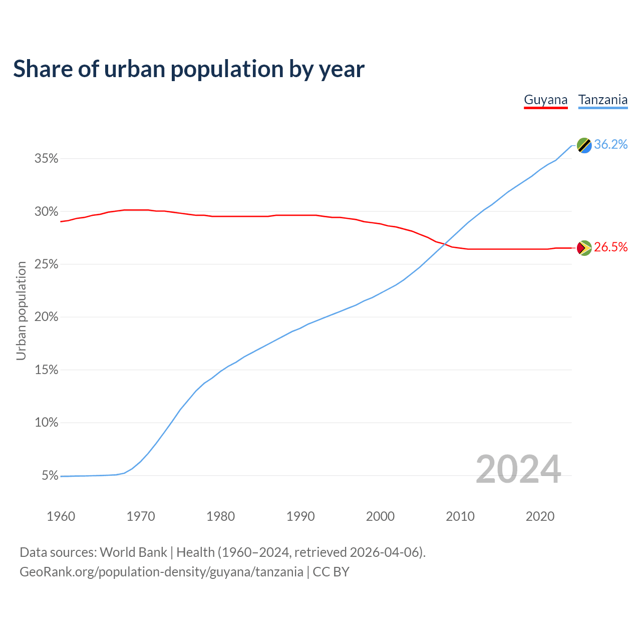 From 2004 to 2024, the share of urban population changed from 28.1% to 26.5% in Guyana and from 24.1% to 36.2% in Tanzania.