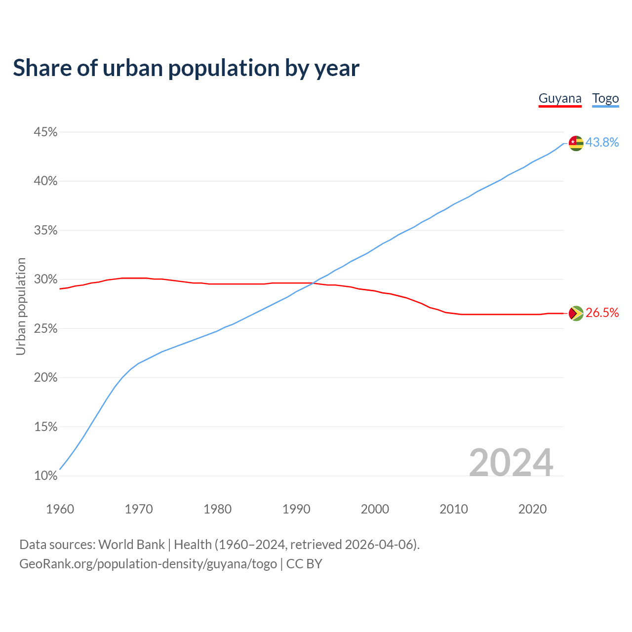 From 2006 to 2026, population density in Guyana increased by 3.3%, compared to a 65.2% growth in Togo.