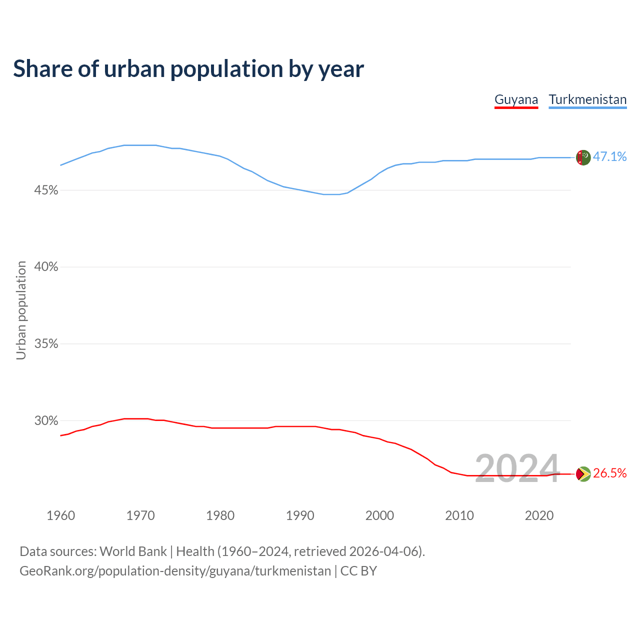 From 2004 to 2024, the share of urban population changed from 28.1% to 26.5% in Guyana and from 46.7% to 47.1% in Turkmenistan.