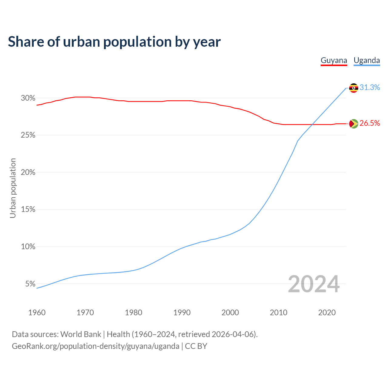 From 2004 to 2024, the share of urban population changed from 28.1% to 26.5% in Guyana and from 13.1% to 31.3% in Uganda.