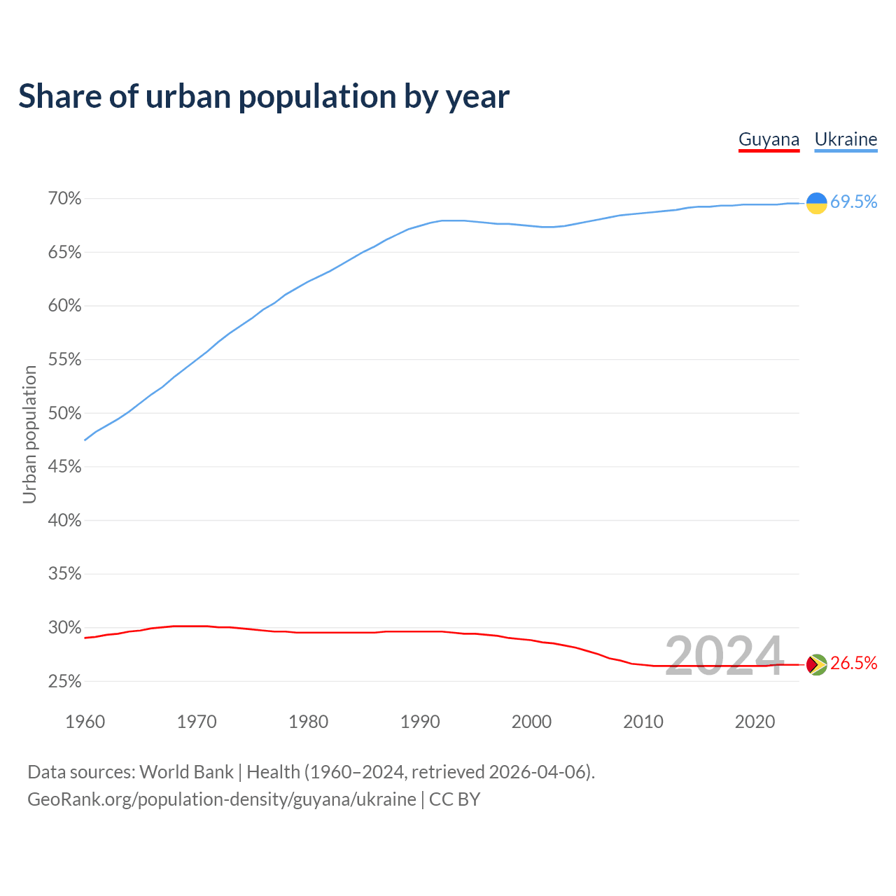 From 2006 to 2026, population density in Guyana increased by 3.3%, compared to a 15.1% decline in Ukraine.