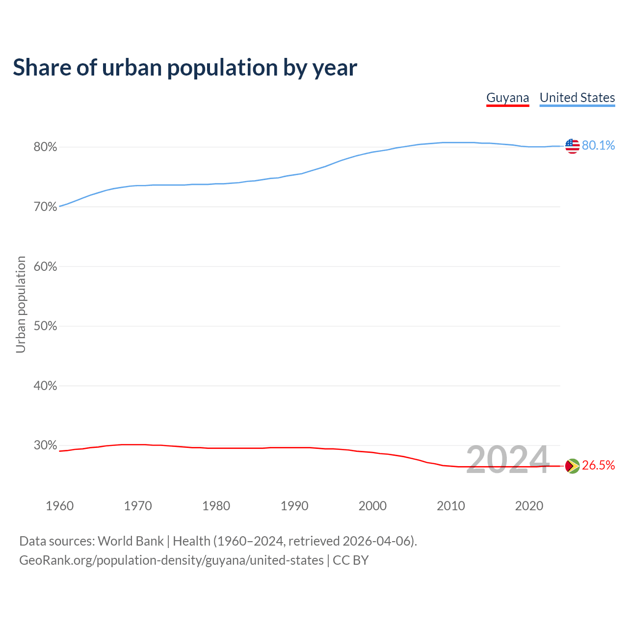 From 2004 to 2024, the share of urban population changed from 28.1% to 26.5% in Guyana and from 80% to 80.1% in the United States.