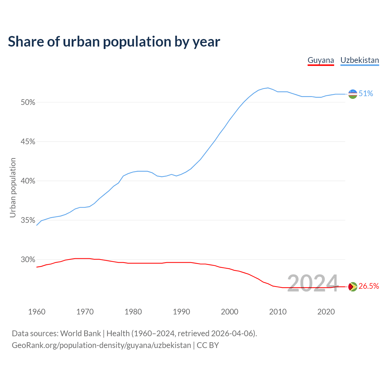 From 2004 to 2024, the share of urban population changed from 28.1% to 26.5% in Guyana and from 50.6% to 51% in Uzbekistan.