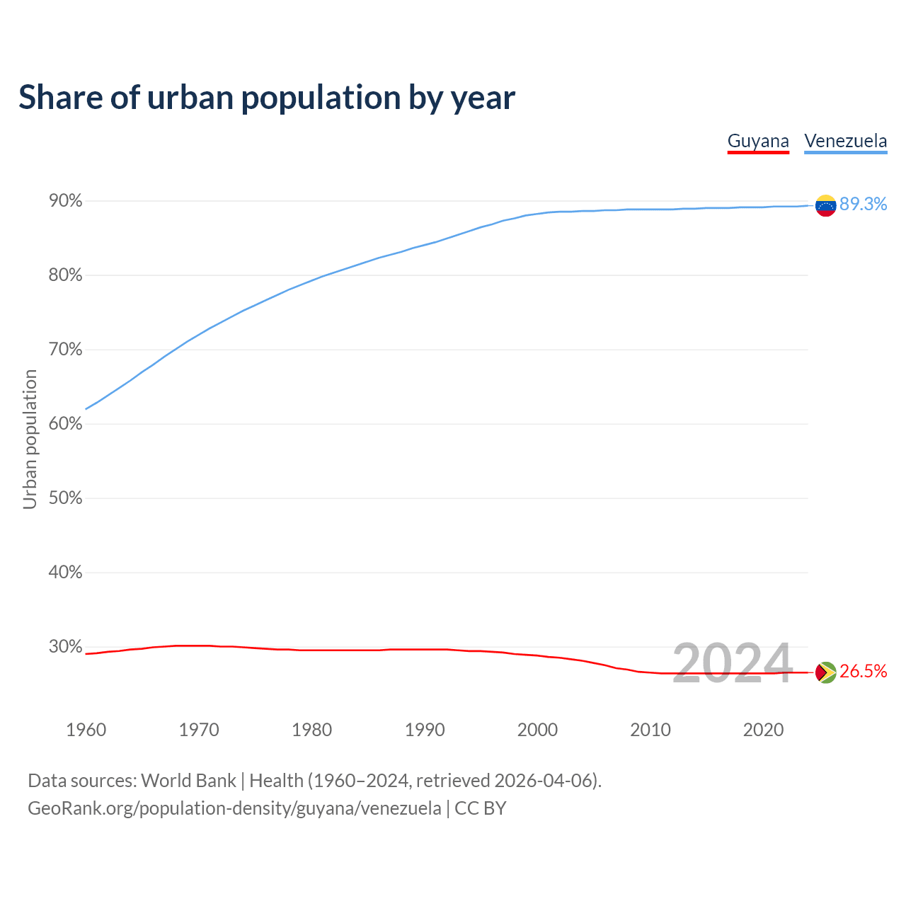 From 2004 to 2024, the share of urban population changed from 28.1% to 26.5% in Guyana and from 88.6% to 89.3% in Venezuela.