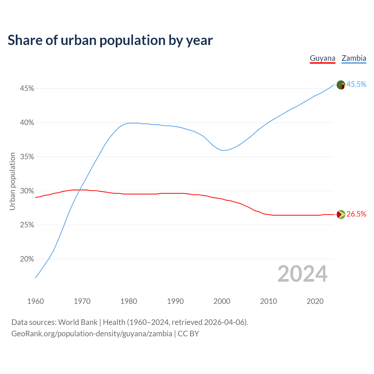From 2006 to 2026, population density in Guyana increased by 3.3%, compared to a 85.7% growth in Zambia.