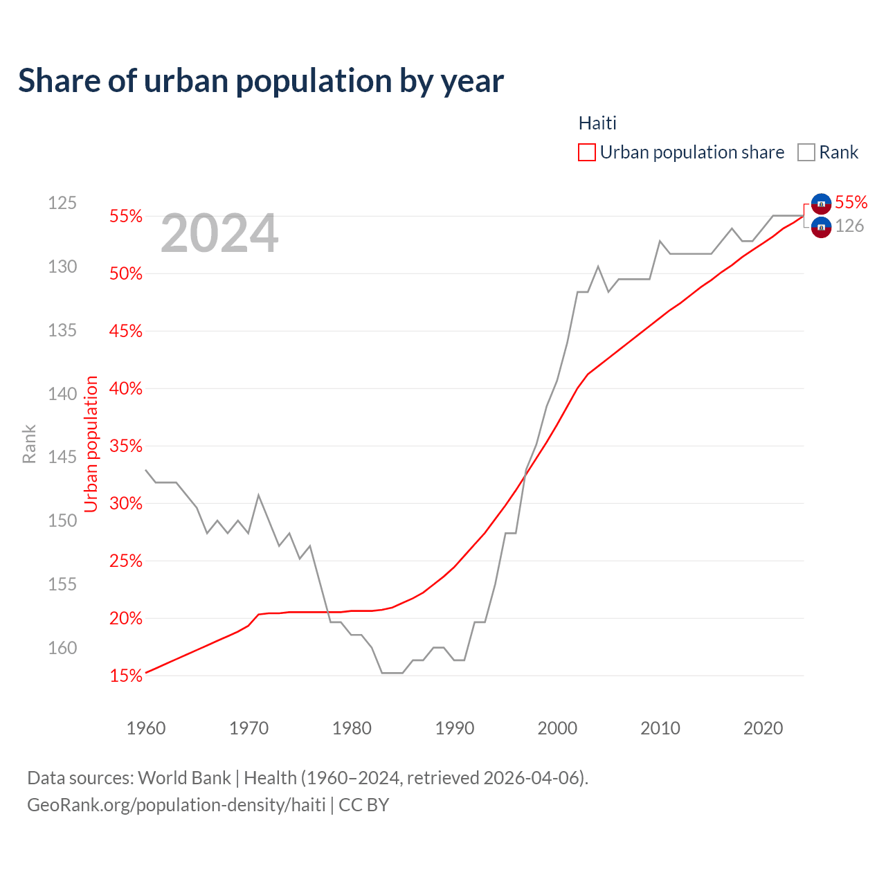 This chart shows the share of urban population in Haiti from 1960 to 2024: 15.2% lived in urban areas in 1960, 36.8% in 2000, and 55% in 2024.