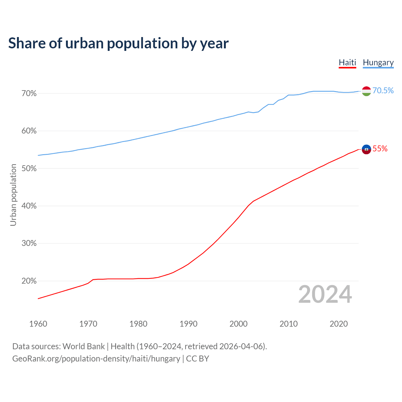 From 2004 to 2024, the share of urban population changed from 41.9% to 55% in Haiti and from 65% to 70.5% in Hungary.