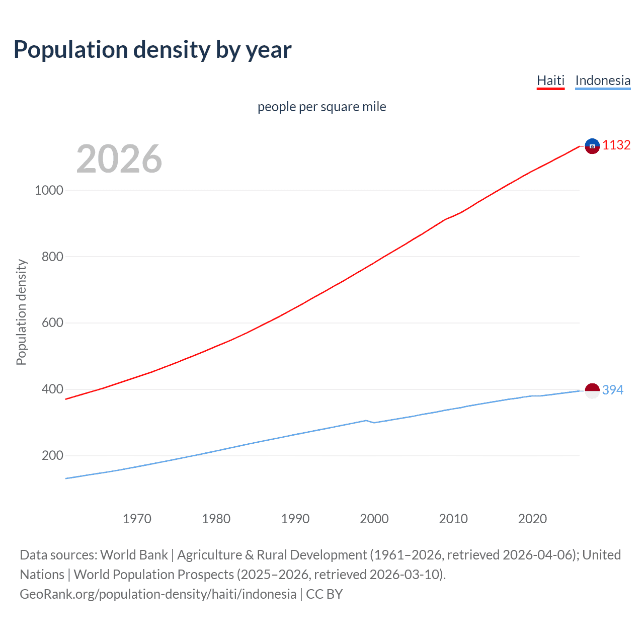 From 2006 to 2026, population density in Haiti increased by 30.6%, compared to a 22.1% growth in Indonesia.